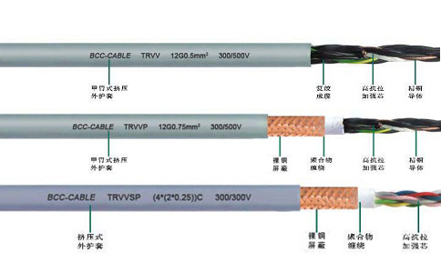 TRVV、TRVVP、TRVVSP電纜都是聚氯乙烯材質的,即PVC護套柔性拖鏈電纜,但應用場合卻不相同。在電纜所處環境狀態良好時,可以選擇TRVV;當外界環境干擾時,可以選擇TRVVP;在外界干擾的環境進行數據傳輸時,可以選擇TRVVSP。kCv拖鏈電纜_聚氨酯卷筒電纜_高柔性電纜生產廠家